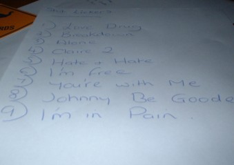 Alcohol changed the usual set around tonight putting the more upbeat songs in the middle of the set and starting off with Love Drug for a change, which ended up being a lot faster than usual as the band settled into their set. Break down followed which was nice and rockier than usual. The usual set opener Alone was next and the band hit their stride here with Claire 2 following. The band then played their 3 favourite songs Hate & Hate, I'm Free and You're With Me. Finishing off with Johnny Be Goode with Ste on vocals and then I'm In Pain.