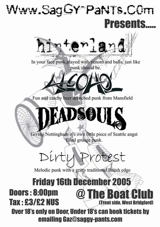 The second gig is at the famous Boat Club in Nottingham which has seen such great bands as Black Sabbath and Led Zep play, Alcohol will play there on the 16th December with Dead Souls, Hinterland and Dirty Protest in a Saggy-Pants organised night.