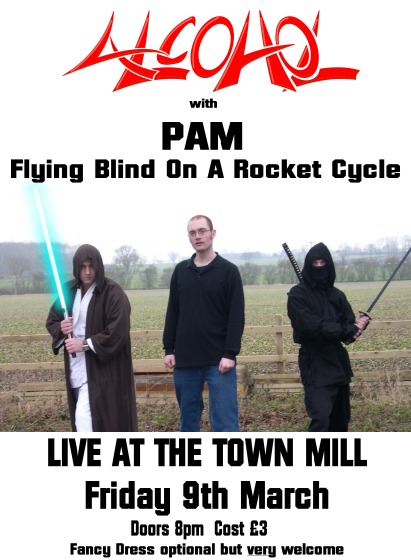 Blimey its come around quick! Alcohol are frantically getting ready for the gig at the mill on Friday 9th March, there will be costumes, guests, new songs/old songs and hopefully a bit of a party atmosphere! PAM and Flying Blind On A Rocket Cycle join the boys for a gig thats going to be hard to top!
